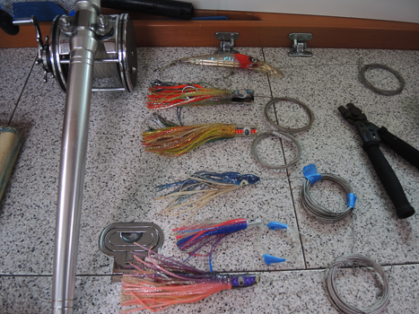Before we head offshore I always put on the harness and Jeannie hoists me to the top of the mast to look at all the fittings top to bottom. This time I found a problem. I am waiting for a rigger to arrive to look at a broken strand in one of the stays.