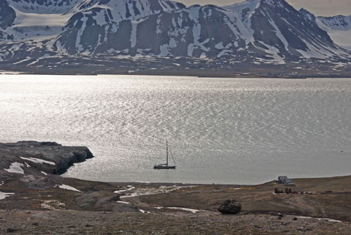 Leonore joined us the next day and we left together for the north. The winds against us were much lighter than forecast. We decided to carry on to this anchorage across the Fjoird from Ny Alesund, a Norwegion research base.