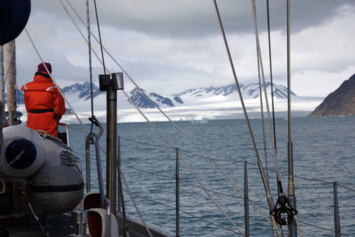 The next day we sailed to Sallyhamna (79 49 N 11 36.9 E) with Leonore. We had agreed that this would be our jumping off point for our sail to the furthest north and our turn around point. We left under cloudy skies with light winds. After we cleared the top of Spizbergen, the last land between us and the pole, the wind picked up to the low 20's. We raced ahead at 9 knots. At 11:45 we crossed 80 degrees north and turned on our radar to look for the ice pack but it was not in sight. With the wind continuing to build and small ice 'growlers' appearing more frequently we did the prudent thing and turn around to head south. The wind was favorable for a southern journey and with our dwindling fuel supply it was an opportunity we had to use.