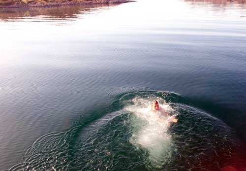 The next four days off of the Mainland were perfect. The two of us explored remote anchorages in 70 temperatures. The green of the forests and shore grasses mixed with the majestic mountains warmed us after the cold starkness of Svalbard. We could not resist staying out of the clear waters but one plunge woke us up to the need to get back to Tromso to meet Jim's two Chicago friends, Ed Bacharach and Richard Kent. They had signed on to help Jim bring Onora 500 miles south to the old capital, Trondheim while Jean traveled to New York to visit our newest grandchild, Hazel, born July 1.