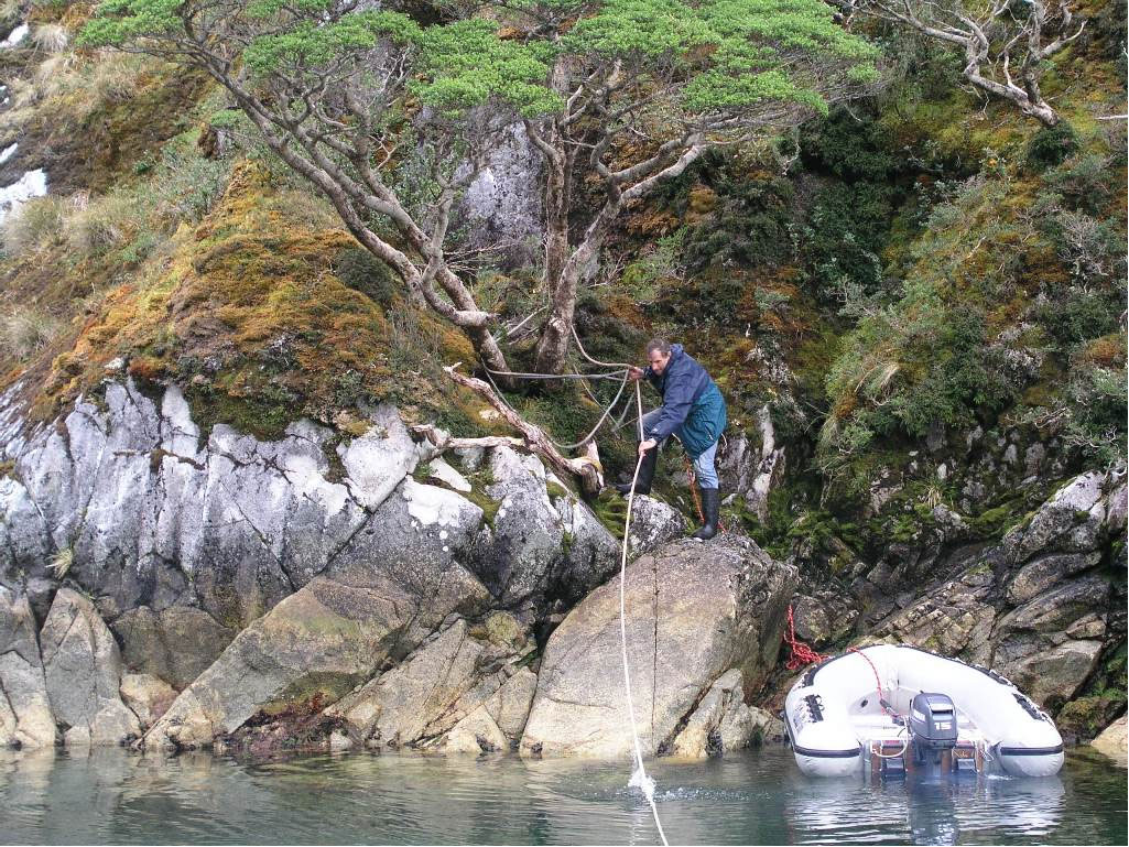 A few weeks ago we were anchoring in Caleta Ferrari in the Beagle Channel. As we backed down on the anchor we threw out the lines to take to shore-it was blowing about 30. One of the lines got away from Jeannie and she went halfway in trying to grab it. It wrapped around the prop.